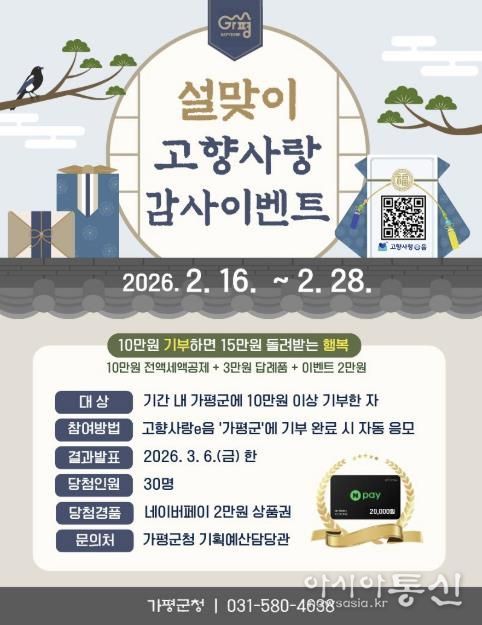 가평군은 설 명절을 맞아 고향사랑기부제 참여 분위기 확산과 기부 활성화를 위해 ‘설맞이 고향사랑 감사이벤트’를 추진한다고 13일 밝혔다.