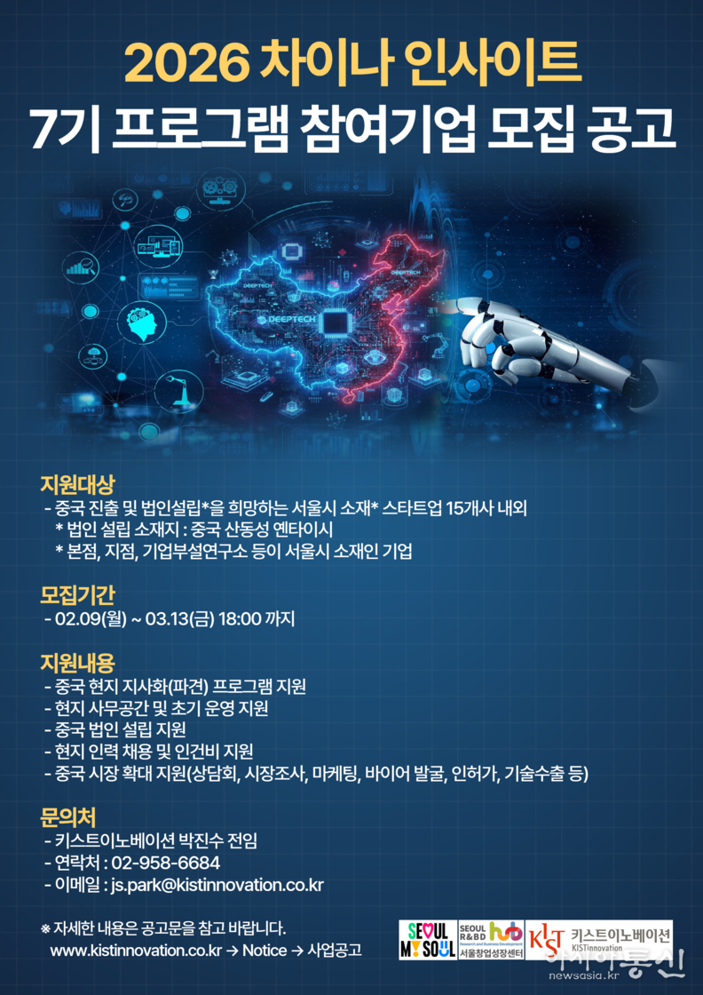 중국 프로그램은 “2026 차이나 인사이트 7기 프로그램”으로 스타트업플러스 플랫폼(www.startup-plus.kr)에 2월 9일(월)부터 3월 13일(금)까지 공고 및 접수 후 서류 및 발표평가를 통해 서울시 창업기업 15개사를 선정하여 4월부터 12월까지 관련 프로그램을 지원할 예정이다.