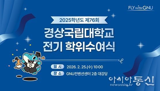 [아시아통신] 경상국립대학교는 2월 25일 오전 10시 가좌캠퍼스 GNU컨벤션센터에서 ‘2025학년도 전기(제76회) 학위수여식’을 열고 박사·석사·학사 학위 취득자들의 새로운 출발을 축하한다.