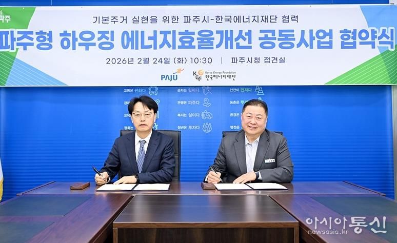 [아시아통신] 파주시는 지난 24일 한국에너지재단과 ‘기본주거 실현을 위한 파주형 하우징 에너지효율개선 공동사업’업무협약을 체결했다.