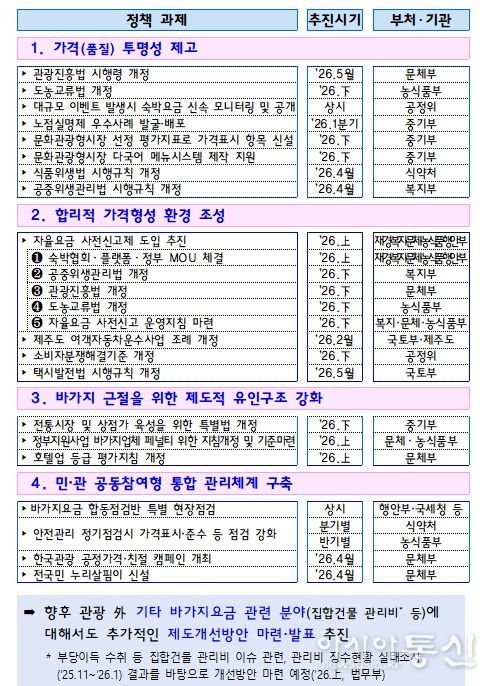 정부는 이번 대책에 따른 제도개선을 위해 관련 법령개정 등 후속조치를 신속히 추진할 예정이다. 또한, 주요 과제들이 현장에 빠르게 안착되어 바가지요금이 근절될 수 있도록 지방정부 및 유관 협・단체와 긴밀히 협조하는 한편, 대책의 주요 내용들을 국민과 업계에 신속히 알리고 과제 추진 상황을 면밀히 모니터링할 계획이다.