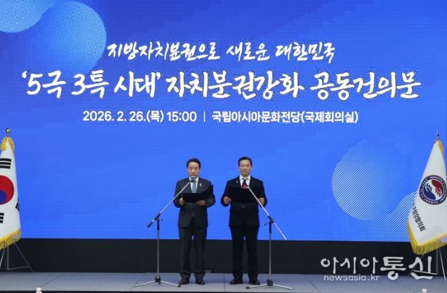 [아시아통신] 대한민국시장·군수·구청장협의회는 2월 26일 광주 국립아시아문화전당에서 민선8기 4차년도 제3차 공동회장단회의를 개최하고,『5극3특 시대 자치분권 강화 공동건의문』을 발표했다.