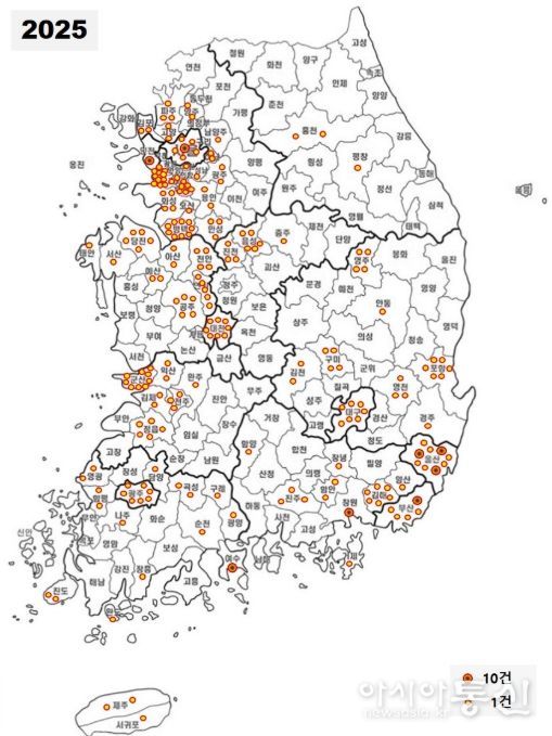 분석 결과, 2025년 한 해 동안 국내에서 발생한 화학사고는 총 282건으로 집계됐다. 지역별로는 산업단지가 밀집한 경기(53건)가 가장 많았으며, 울산(36건), 경남(25건), 전남(25건), 전북(22건), 경북(21건) 등이 뒤를 이었다.