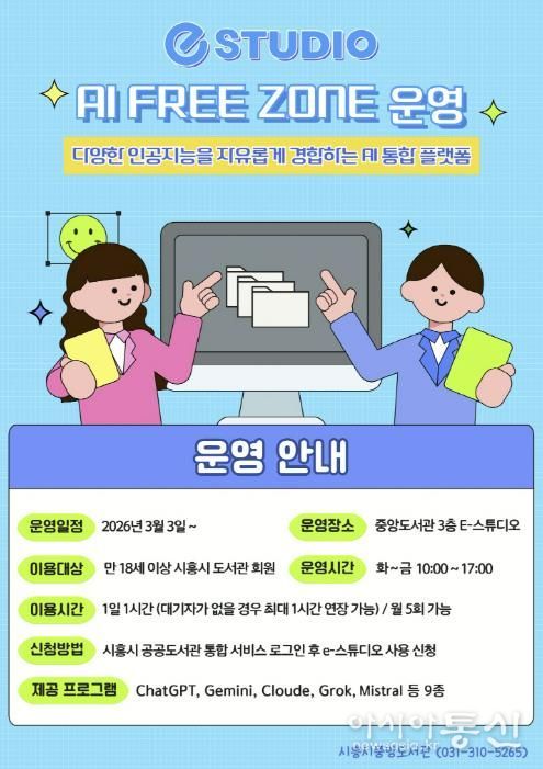 [아시아통신] 시흥시중앙도서관은 시민들의 인공지능(AI) 활용 역량 강화를 위해 시 정보통신과와 협업해 도서관 3층 e-스튜디오에 ‘인공지능(AI) 프리 존(Free Zone)’을 구축하고, 오는 3월 3일부터 본격 운영에 들어간다.