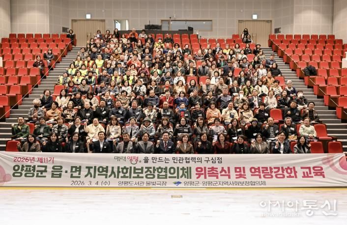 [아시아통신] 양평군은 지난 4일 양평도서관 물빛극장에서 250여 명이 참석한 가운데 ‘2026년 제11기 읍면 지역사회보장협의체 위촉식 및 역량 강화 교육’을 개최하고, 지역 맞춤형 복지안전망 강화를 위한 본격적인 활동에 들어갔다고 밝혔다.