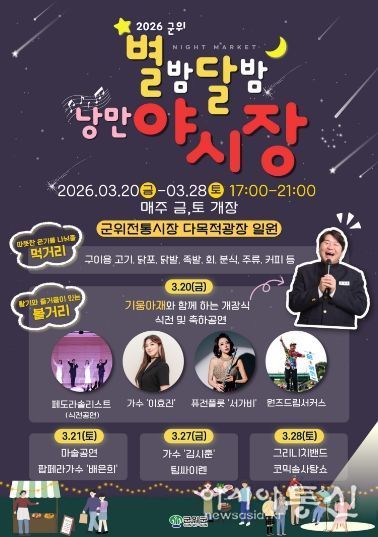 [아시아통신] 군위군은 전통시장에 활력을 불어넣고 군민과 방문객들에게 봄밤의 추억을 선사하기 위해 '군위전통시장 별밤달밤 낭만 야시장'을 오는 3월 20일 개장해 3월 28일까지 매주 금요일과 토요일 운영한다고 밝혔다.