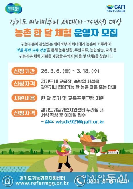 [아시아통신] 경기도와 경기도농수산진흥원은 ‘경기도 베이비부머 농촌 한 달 체험’을 운영할 마을·단체 2곳을 오는 18일까지 모집한다.
