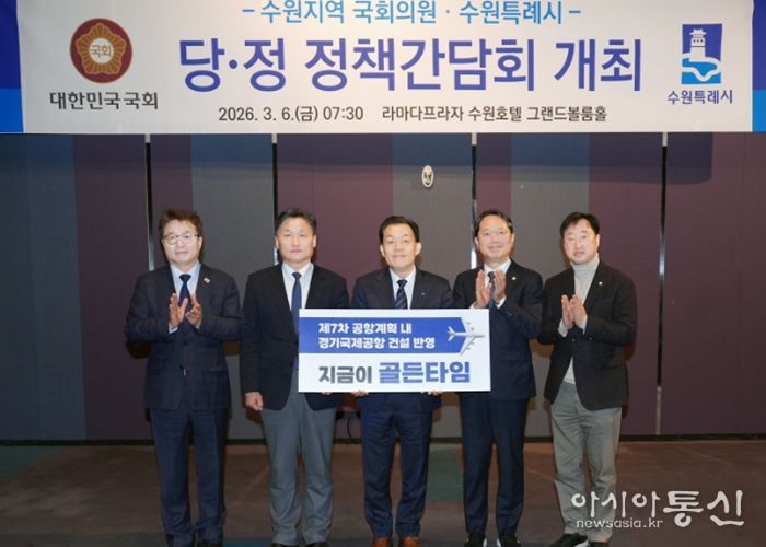 [아시아통신] 이재준 수원특례시장은 6일 라마다프라자 수원호텔에서 열린 지역 국회의원들과 당·정 정책간담회에서 “제7차 공항개발 종합계획에 ‘경기국제공항’ 건설 내용이 반영될 수 있도록, 경기도와 협의해 달라”고 요청했다.
