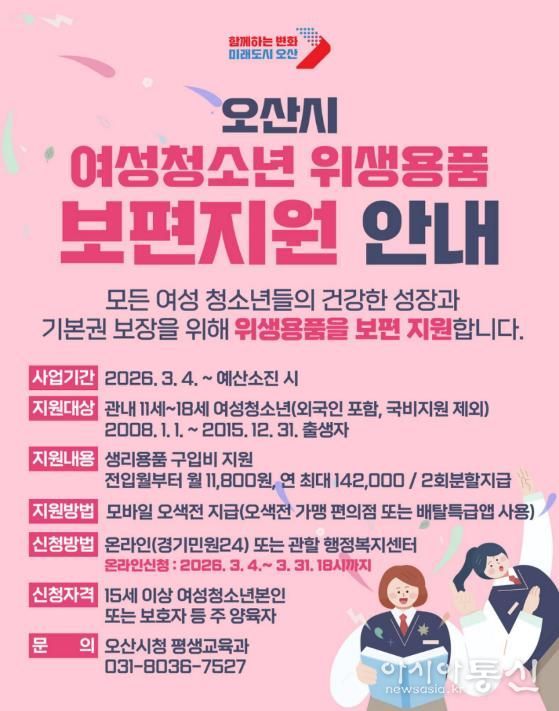 [아시아통신] 오산시는 관내 11세부터 18세까지의 여성청소년을 대상으로 '여성청소년 위생용품 보편지원 사업'을 추진한다고 밝혔다.