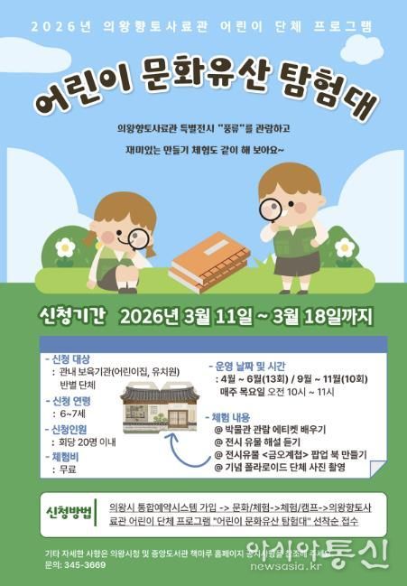 [아시아통신] 의왕시 향토사료관이 오는 4월부터 6월, 9월부터 10월 매주 목요일에 어린이 단체 체험프로그램 ‘어린이 문화유산 탐험대’를 운영한다.