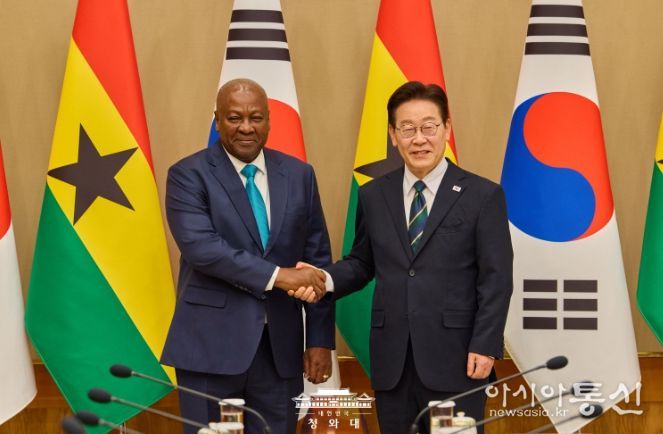 [아시아통신] 이재명 대통령은 11일 오후 우리나라를 실무 방한한 존 드라마니 마하마 가나 대통령과 정상회담을 가졌다고 강유정 청와대 대변인이 서면 브리핑을 통해 밝혔다.