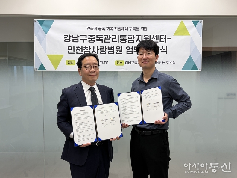 꿈이 모이는 도시, 미래를 그리는 강남구가 마약류 중독 등 중독 문제에 보다 전문적으로 대응하기 위해 인천참사랑병원과 치료·재활 협력체계를 구축했다. 강남구중독관리통합지원센터(센터장 변기환)와 인천참사랑병원(병원장 천영훈)은 지난 3월 11일 강남구중독관리통합지원센터(강남구 보건소 5층)에서 업무협약을 체결하고, 중독 치료부터 지역사회 재활까지 이어지는 연속적인 지원체계를 마련하기로 했다.