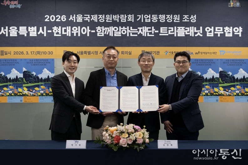 서울시는 현대위아, 함께일하는재단, 트리플래닛과 5월 1일 개막하는 ‘2026 서울국제정원박람회’의 기업동행정원 업무협약(MOU)을 3월 17일 서울시청에서 체결했다.