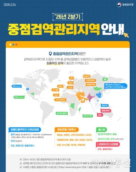 [아시아통신] 질병관리청은 해외감염병 발생 동향과 위험평가를 바탕으로 2분기 중점검역관리지역과 검역관리지역을 지정·해제하고, 4월 1일 자로 시행한다.