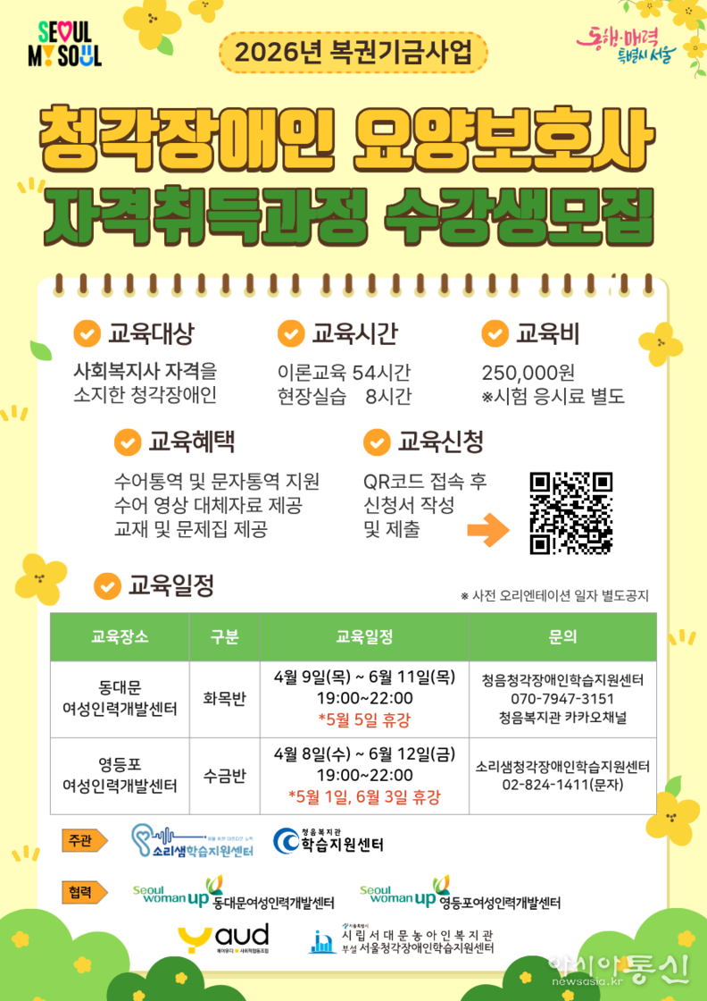 서울시가 추진하는 ‘2026 청각장애인 요양보호사 양성 교육’은 4월 8일(수)부터 6월 12일(금)까지 9주간 청각장애인 40명을 대상으로 진행된다.