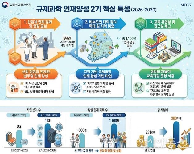 사업에 선정된 기관들은 앞으로 5년간(2026~2030년) 총 347억을 지원받으며, 학위과정 및 비학위과정을 포함해 규제과학 전문성과 실무역량을 동시에 갖춘 총 1,100명의 규제과학 전문인력을 체계적으로 양성한다.