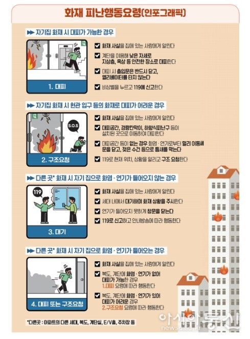 [아시아통신] 소방청은 최근 아파트 화재가 잇따라 발생함에 따라, 인명피해를 최소화하기 위해 무리한 대피보다는 화재 상황을 먼저 판단하고 행동하는 상황별 피난 행동요령을 철저히 준수해 줄 것을 당부한다고 17일 밝혔다.