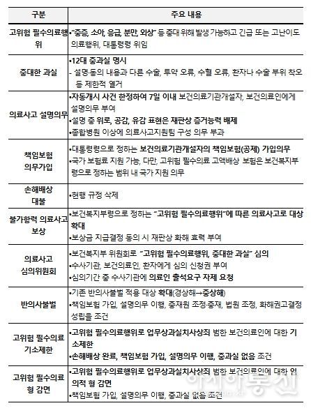 불가항력 의료사고 보상 대상을 기존 분만사고에서 ‘보건복지부령으로 정하는 고위험 필수의료행위’로 확대하여 필수의료에 대한 국가책임을 강화했다. 보상 대상인 고위험 필수의료행위의 범위·유형에 대해서는 의료계, 전문가 등과 논의하여 보건복지부령을 통해 구체화할 예정이다.