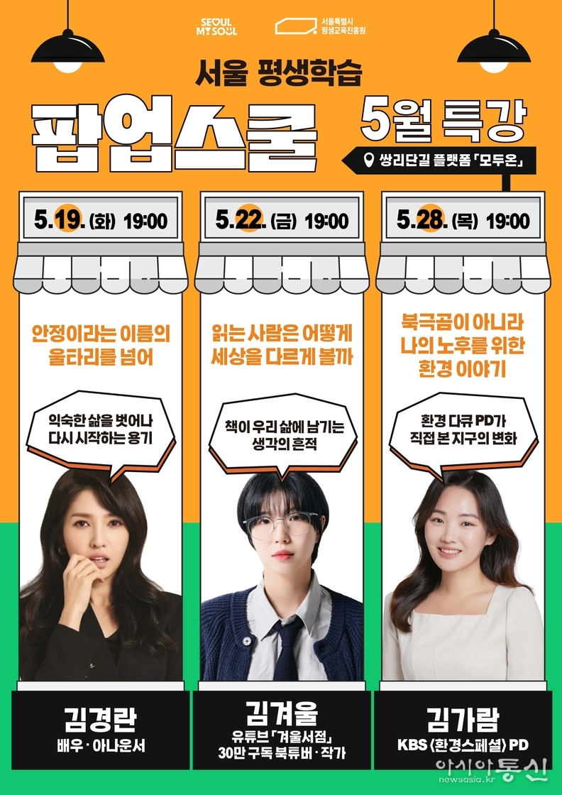 서울특별시평생교육진흥원이 지난 4월 도봉구 쌍문역 인근에 개관한 서울시 첫 역세권 평생학습 거점 ‘서울 평생학습 팝업스쿨’을 확대 운영한다. 시범운영 한 달간 500여 명이 참여했으며, 5월에는 ▴정규강좌 ▴명사특강 ▴러닝숍 등 3개 영역에서 총 13개 과정을 편성하고, 650명의 시민 참여를 목표로 한다.