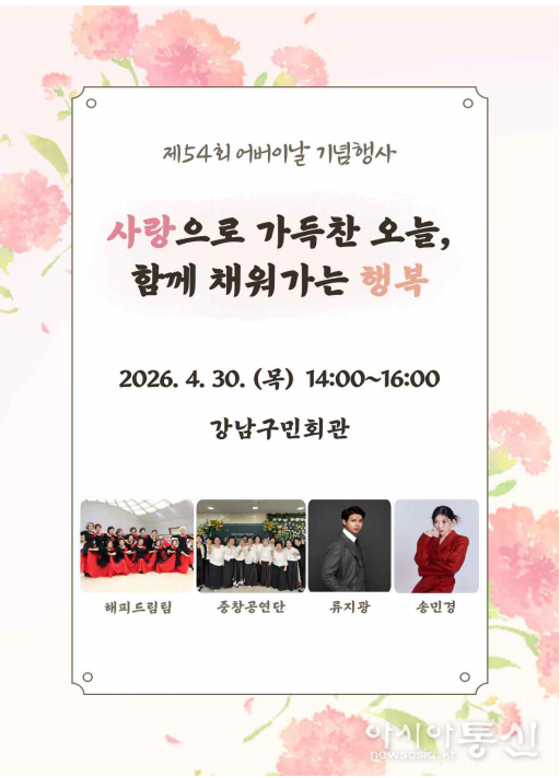 꿈이 모이는 도시, 미래를 그리는 강남구(구청장 조성명)가 제54회 어버이날을 맞아 4월 30일 오후 2시부터 4시까지 강남구민회관에서 기념행사를 개최하고, 5월 8일에는 7개 노인복지관에서 다채로운 행사를 이어간다.