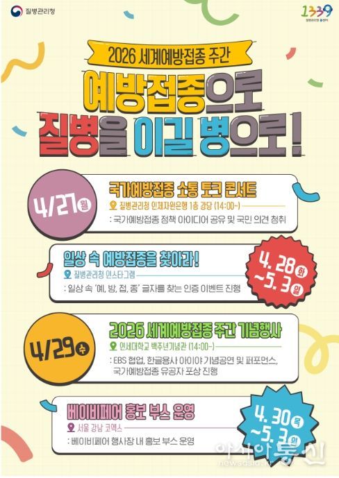 [아시아통신] 질병관리청은 세계보건기구(WHO)가 정한 세계예방접종주간(매년 4월 마지막 주)을 기념하여 4월 27일부터 5월 3일까지 일주일 동안'2026 예방접종주간행사'를 운영한다.