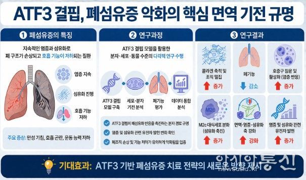 연구진은 “폐섬유화 진행 과정에서 면역세포의 염증 반응과 조직 섬유화를 동시에 조절하는 새로운 분자 기전을 규명한 것”이라며 “초기 스트레스에 반응하는 ATF3 유전자가 염증 반응의 과도한 활성화를 억제하고 폐섬유화 진행을 완화하는 핵심 역할을 수행한다는 사실을 확인했다는 점에서 의미가 있다”고 밝혔다.