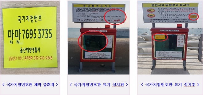 울산해양경찰서(서장 임명길)는 연안해역에서 안전사고 발생 시 정확한 위치 특정을 위해 자체 선정 한 연안 위험구역 34개소의 해안가, 방파제, 갯바위 등 안전관리시설물에 국가지점번호를 표기하여 신속 대응을 위한 골든타임을 확보하겠다고 밝혔다. 국가지점번호란 국토 및 이와 인접한 해양을 격자형으로 일정하게 구획한 지점마다 부여한 번호(문자와 아라비아 숫자)를 말하며, 도로명이 부여되지 않은 비거주지역의 위치표시체계를 보완하기 위해 구획한 지점의 번호를 부여하는 서비스 제도이다. 특히, 지형지물이 명확하지 않은 낯선 곳에서 조난이나 실족 등을 당해 도움이 필요한 경우 국가지점번호판의 고유번호를 알려 위치를 신속하게 파악해 응급상황 발생 시 신속한 대응 및 골든타임을 확보할 수 있다. 울산해경은“위치를 확인하기 어려운 해안가, 방파제, 갯바위 등에 설치된 인명구조함 및 안전표시판의 안전관리시설물에 국가지점번호를 표시하고 체계적인 관리를 통해 국민의 소중한 생명과 안전을 지키는데 힘쓰겠다”고 밝혔다.