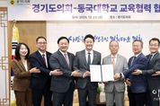 [아시아통신] 경기도의회는 23일 오전 의장 접견실에서 동국대학교와 교육협력 및 학술교류를 위한 업무협약(MOU)을 체결했다. 이날 협약식에는 김진경 의장(더민주, 시흥3)과 고준호 의원(국민의힘·파주1), 김완규 의원(국민의힘·고양12), 이병숙 의원(더민주·수원12), 박호순 의정국장이 참석했다. 동국대학교에서는 윤재웅 총장, 김용현 교무부총장, 김승용 대학원장, 유한림 BMC(바이오메디캠퍼스) 행정처장 등이 함께 자리해 협약의 의의를 더했다. 양 기관은 이번 협약을 계기로 ▲의정 발전을 위한 정보 교류 ▲전문 인재 양성을 위한 교육·연구 지원 ▲도의원 및 의회 직원 대상 대학원 장학금 지원 등 의정 활동 역량 강화를 위한 체계적인 교육 협력에 나서기로 했다. 윤재웅 총장은 “대학의 교육·연구 역량을 공유함으로써 경기도 발전에 기여할 수 있게 되어 뜻깊다”며 “경기도의회와의 지속적인 협력을 통해 실효성 있는 교육 지원을 이어갈 수 있도록 최선을 다하겠다”라고 말했다. 김진경 의장은 “의회에 대한 도민의 기대는 점점 더 복잡해지고 다양화되고 있는 만큼 의회 구성원 모두가 더 많이 배우