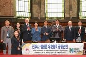 [아시아통신] 전주시와 호주의 대표도시인 멜버른시가 상호 발전을 응원하는 동반자가 되기로 했다. 우범기 전주시장이 이끄는 전주시 대표단은 현지시간으로 지난 10일 호주 멜버른 시청을 방문해 케빈 로웨이 멜버른 시의원과 오진관 주 멜버른 대한민국 총영사, 마크 코크레인 멜버른 국제협력실 국장, 멜버른 지역 언론사 등이 참석한 가운데 양 도시간 교류를 더욱 발전시키기로 뜻을 모았다. 특히 양 도시는 이 자리에서 우호적 국제관계를 맺는 공동선언에 나섰다. 이날 서명한 협력 체결서에는 △문화예술교류 활성화 △문화산업 및 관광·도시디자인 협력 △지속가능한 문화경제 발전 △공공·민간협력 네트워크 구축 등의 내용이 담겨 있다. 전주시와의 국제교류를 약속한 멜버른시는 호주 빅토리아주 기초자치단체 중 핵심이 되는 도시로, 호주 내에서도 가장 살고 싶은 도시로 선정된 바 있다. 우 시장을 비롯한 전주시 대표단과 멜번시 관계자들은 우호 협력 체결 이후 문화예술과 관광, 스포츠, 경제, 도시디자인, 교육 등 다양한 분야의 교류 확대 방안을 논의하기도 했다. 전주시 대표단은 멜버른시청 방문에 앞
