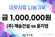 [아시아통신] 고성군은 제승건설(주)가 9월 17일 고성군청 주민생활과를 통해 민족 최대의 명절인 추석을 앞두고 어려운 이웃을 위해 써달라며 성금 100만 원을 전달했다고 밝혔다. 윤지영 대표는 “작은 정성이지만 우리 주변의 어려운 이웃들이 따뜻하고 훈훈한 추석 명절을 보내는 데 도움이 됐으면 좋겠다”라며, “앞으로도 지속적인 기부와 관심을 통해 나눔에 앞장서겠다”라고 전했다. 정영랑 주민생활과장은 “지역사회의 어려운 이웃을 위해 따뜻한 손길을 내밀어 주신 제승건설(주)과 윤지영 대표님께 감사드린다”라며, “소중한 성금은 꼭 필요한 곳에 잘 전달하여 모두가 따뜻한 명절을 보내도록 최선을 다하겠다”라고 전했다. 기탁된 성금은 경남사회복지공동모금회를 통해 관내 어려운 이웃들을 위해 소중히 사용될 예정이다.