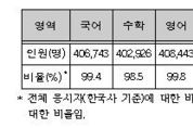 [아시아통신] 한국교육과정평가원(원장 오승걸)은 지난 9월 3일 전국적으로 실시된 2026학년도 대학수학능력시험(이하 수능) 9월 모의평가 채점 결과를 9월 30일(화)에 수험생에게 통지한다. 개인별 성적통지표는 접수한 곳(재학 중인 학교, 시험 지구 교육청, 출신 학교 등)을 통하여 수험생에게 교부한다. 아울러 수험생 진학 지도를 위해 '영역/과목별 등급 구분 표준점수 및 도수분포'자료도 공개한다. 2026학년도 수능 9월 모의평가에 응시한 수험생은 409,171명으로 재학생은 319,073명, 졸업생과 검정고시 합격자 등은 90,098명이었다. 영역별 응시자 수는 국어 영역 406,743명, 수학 영역 402,926명, 영어 영역 408,443명, 한국사 영역 409,171명, 사회·과학탐구 영역 402,716명, 직업탐구 영역 3,762명, 제2외국어/한문 영역 7,341명이었다. 사회·과학탐구 영역 응시자 중 사회탐구만 응시한 수험생은 238,563명, 과학탐구만 응시한 수험생은 91,609명, 두 영역을 조합해 응시한 수험생은 72,544명이었으며, 응시자 대부분(99.4%)이 2개 과목에 응시했다.
