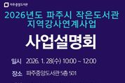 [아시아통신] 파주시 중앙도서관은 지역의 작가, 예술가, 독서문화 활동가 등 인재를 발굴해 작은도서관의 독서문화 프로그램을 지원하는 녪년 작은도서관 지역강사 연계사업’에 참여할 지역강사를 모집한다. ‘작은도서관 지역강사 연계사업’은 2021년부터 추진하여 시민들이 작은도서관에서 지역의 작가, 예술가, 독서문화 활동가와 만나 다양한 독서문화 활동을 체험할 수 있도록 지원해 온 인기 사업이다. 특히 2025년에는 약 1,200명의 시민이 참여해 독서문화 확산과 작은도서관 운영 활성화에 크게 기여했다. 오는 28일 10시 중앙도서관에서 참여하고자 하는 강사들을 위해 모집 전 ‘강사 사업설명회’를 개최한다. 설명회에서는 사업 취지와 신청서 작성방법 등을 설명하여, 지역 작가, 예술가, 독서문화 등 다양한 역량을 가진 강사가 참여할 수 있도록 안내할 예정이다. 2026년도 지역강사 연계사업에 참여하여 강사로 활동하고자 하는 인재들은 오는 29일부터 2월 10일까지 신청서를 작성해 제출하면 된다. 또한, 2월 26일에는 서류심사를 통과한 강사를 대상으로 박람회 형식의 프로그램 설명회인 ‘지역강사박람회’를 금촌