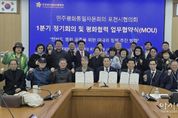 [아시아통신] 민주평화통일자문회의 포천시협의회는 지난 2월 27일 포천시청 시정회의실에서 ‘2026년 1분기 정기회의 및 평화통일 협력 업무협약 체결식’을 개최했다. 이번 행사는 조용춘 협의회장을 비롯한 자문위원들과 업무협약 체결 기관 관계자, (사)공정평화통일국민연대 포천시지회 및 기후위기 포천시민행동 관계자 등이 참석했다. 1부 정기회의에서는 지역 내 통일 기반 조성을 위한 정책 건의와 의견 수렴이 이루어졌으며, 2026년 상반기 주요 사업에 대해 논의했다. 2부 행사에서는 지역 시민단체와 업무협약을 체결했다. 이번 협약을 통해 각 기관은 평화통일을 위한 협력 체계를 공고히 구축하기로 뜻을 모았다. 또한, 이날 행사에서는 평화통일 기반 구축에 기여한 공로로 임지은 자문위원이 경기도지사 표창을 전수받는 영예를 안았다. 조용춘 협의회장은 개회사를 통해 “이번 정기회의는 급변하는 정세 속에서 한반도 평화 공존을 위한 실천적 방안을 모색하는 뜻깊은 자리”라며, “지역 시민단체와 긴밀한 협력을 통해 포천시가 평화통일의 마중물 역할을 수행할 수 있도록 자문위원들의 지혜를 모아달라”고 당부했다.