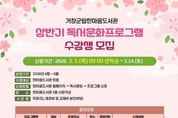 [아시아통신] 거창군 한마음도서관은 오는 3월 5일부터 군민들의 지적 욕구를 충족시키고 문화적 소양을 높이기 위한 ‘상반기 독서문화 프로그램’ 수강생을 모집한다. 이번 프로그램은 4월 1일부터 6월 30일까지 운영되며, 초등학생부터 성인까지 전 세대가 참여할 수 있도록 다채로운 강좌로 구성됐다. 수강 신청은 한마음도서관 누리집에서 가능하며 수강료는 무료이나 재료비는 본인 부담이다. 먼저 초등학생 대상으로는 그림책을 읽고 다양한 미술 기법으로 감상을 표현하는 ‘그림책 아트팡팡’과 영어 그림책을 함께 읽으며 독후 활동을 진행하는 ‘잉글리쉬 Book플레이’ 등 2개 강좌를 운영해 어린이들의 흥미로운 독서 경험과 올바른 독서 습관 형성을 돕는다. 성인을 위한 프로그램으로는 취미와 인문학적 소양을 함께 기를 수 있는 5개 강좌가 마련됐다. 감성을 깨우는 ‘한마음시낭송’을 비롯해 ‘주역’, ‘수수공방’, ‘보타니컬아트’ 그리고 명화를 통해 인간의 심리를 이해하는 ‘명화 속 심리학’ 등 다양한 강좌가 운영되어 일상에 예술적 깊이와 배움의 즐거움을 더할 예정이다. 한편, 프로그램 문의는 한마음도서관 누리집를 통해