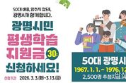 [아시아통신] 광명시가 50대 중장년 시민의 배움 기본권 보장을 위해 올해도 평생학습지원금 지원을 이어간다. 시는 오는 3월 3일부터 13일까지 11일간 ‘2026년 광명시민 평생학습지원금’ 신청을 받는다고 26일 밝혔다. 광명시민 평생학습지원금은 생애 전환기를 맞은 50대 시민이 나이·소득·배경과 관계없이 배움을 지속할 수 있도록 생애 1회 1인당 30만 원의 평생학습이용포인트를 지원하는 사업이다. 시민 스스로 자신의 삶과 필요에 맞는 학습을 선택하도록 돕는 것이 핵심 목적이다. 박승원 광명시장은 “배움은 선택이 아닌 누구에게나 보장돼야 할 기본권”이라며 “시민이 나이나 환경의 제약 없이 언제든지 배움을 이어갈 수 있도록 평생학습 기반을 더욱 탄탄히 만들어가겠다”고 밝혔다. 신청 대상은 1967년 1월 1일부터 1976년 12월 31일 사이에 출생한 50대 광명시민이다. 광명시에 1년 이상 계속 거주했거나, 거주기간을 합산해 5년 이상 거주하고 있어야 한다. 시는 총 2천500명을 선정해 지원한다. 59세(1967년생)는 올해가 마지막 지원 대상임을 고려해 우선 선정하고, 1968~1