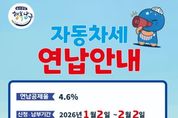 [아시아통신] 울산 남구는 오는 2월 2일까지 올해 1월 자동차세 연납 신청을 접수한다고 밝혔다. 자동차세 연납은 매년 6월과 12월 두 차례 정기 납부하는 자동차세를 일시에 납부하면 납부 시기에 따라 세액을 공제해 주는 제도로 지난해와 동일하게 1월 연납은 연세액의 약 4.6%가 공제된다. 자동차세 연납 신청은 차량 소재지 관할 구청에 직접 방문하거나 전화로 신청 또는 인터넷(위택스)으로도 가능하다. 기존 연납한 차량은 다음 해에 별도로 신청하지 않아도 납부서가 발송되며, 자동차를 새로 등록한 경우에는 별도 신청이 필요하다. 납부 기한은 2월 2일까지이며 미납 시 연납은 취소되고 6월과 12월에 기존세액으로 정기분 자동차세가 부과된다. 납부 방법으로는 △전국 금융기관 고지서 납부 △금융기관 CD/ATM기에서 본인 통장, 현금카드, 신용카드 조회 및 납부 △금융기관 방문 없이 모바일페이, 위택스, ARS, 지방세입계좌 및 가상계좌 이체 등 다양한 방법으로 편리하게 납부할 수 있다. 남구 관계자는 “주민들의 납세편의를 위해 ‘큰 글씨 자동차세 연납 납부서’ 를 발부해 구민들이