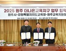 [아시아통신] 원주시는 지난 18일 시청 7층 투자상담실에서 ‘원주 더나은교육지구’ 지정 연장 업무협약을 체결했다. 협약식에는 원강수 원주시장, 신경호 강원특별자치도 교육감, 김성진 원주교육지원청 교육장이 참석했다. 더나은교육지구는 원주시와 강원특별자치도교육청, 원주교육지원청이 협약을 통해 구축하는, 마을과 학교가 함께하는 지역 교육공동체다. 이번 협약은 1기(2018-2021)와 2기(2022-2025)에 이어 추진되는 3기 사업으로, 2026년부터 2029년까지 4년간 운영된다. 원주시와 도 교육청이 매년 각각 2억 원씩, 총 16억 원의 사업비를 지원한다. 3기 사업 지난 사업 추진 실적을 바탕으로 새롭게 개편됐으며, ‘배움과 성장, 문화예술로 동행하는 원주’를 비전으로 4개의 추진 과제와 12개의 세부 사업으로 구성됐다. 이를 통해 지역과 학교가 함께 성장하는 교육 기반을 더욱 강화할 계획이다. 특히 3기에서는 비전에 걸맞은 다양한 문화예술 프로그램이 추진된다. 원주의 특화 산업인 한지 교육을 통해 민·관·학 협력 분위기를 조성하고, 지역 문화·관광 자원을 직접 체험할 수 있는 프로그램도 확