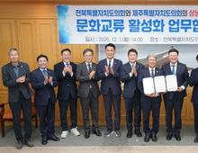 [아시아통신] 전북특별자치도의회와 제주특별자치도의회는 문화·관광·세계유산 분야 협력을 강화하기 위해 1일 전북도의회 의장실에서 문화교류 활성화 업무협약(MOU)을 체결했다. 이날 협약식에는 전북자치도의회에서 문승우 의장을 비롯해 이명연 부의장, 김희수 부의장, 윤수봉 운영위원장, 박정규 문화안전소방위원장, 김성수 문화안전소방부위원장, 김정기 문화안전소방위원 등 7명이 참석했다. 제주도의회의 경우 이상봉 의장과 임정은 운영위원장, 박호형 행정자치위원장, 현길호 보건복지안전위원장, 정민구 환경도시위원장 등 5명이 자리했다. 협약에 따라 양 의회는 ▲세계유산·세계기록유산 연계 활성화 ▲역사·문화 기반 교류 ▲관광콘텐츠 공동 개발 ▲국제 문화·스포츠 협력 ▲미래지향적 상생발전 추진 등에 협력하기로 했다. 문승우 의장은 “이번 협약은 문정공 지포 김구 선생(전북 부안 출신의 고려 후기 문신으로, 제주 판관 재임 시 백성을 위해 돌담을 쌓도록 독려하는 등 선정을 베푼 인물)의 교류 전통을 오늘에 잇는 뜻깊은 계기”라고 강조했다. 이어 "제주는 생태·신화·해녀문화 등 세계적으로 독보적인 자산을 가진 지역"이라며, "이번 협