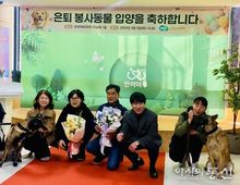 [아시아통신] 경기도가 지난달 육군 군견훈련소에서 반려마루 여주로 데려온 은퇴군견 ‘푸른’, ‘염토’, ‘키위’ 3마리 모두가 새로운 가족을 만났다. 경기도는 3일 입양을 가게 된 ‘염토’, ‘키위’와 입양가족 등 관계자가 참석한 가운데 축하식을 열고 입양 서약서와 입양 물품 및 꽃다발 전달, 기념 촬영을 진행했다. ‘푸른’이는 사전 입양을 기다리고 있는 가족이 있어 건강검진과 이동훈련을 마치고 지난 2월 26일 새터전으로 옮겼다. ‘염토’와 ‘키위’는 반려마루 여주에서 입양 홍보를 시작하자마자 입양 희망가족이 생겨 절차를 마치고 입양됐다. 은퇴군견 3마리는 반려마루 여주로 온 지 1개월도 안돼 새로운 견생을 시작하게 됐다. 키위를 입양한 입양자 이기철님은 “평소 군견에 대한 관심이 있었고, 대형견을 키울 수 있는 여건이기에 이왕이면 봉사동물의 남은 여생을 편하게 해주고 싶다는 생각이 들었다”며 “염토와 키위를 만나보니 애교도 많고 뛰어오르며 손을 핥는데 같이 운동도 많이 하면서 지내야 할 것 같다”며 소감을 전했다. 육군 군견훈련소 관계자는 반려마루 여주로 온 은퇴군견의 빠른 입양 소식을 듣고 “