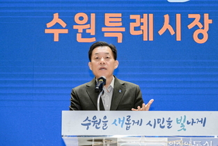 [아시아통신] 이재준 수원특례시장이 8일 오후 수원의 심장부인 화성행궁 광장에서 기자회견을 열고 "수원 대전환의 완성을 위해 민선 9기 수원시장 재선에 출마한다"고 공식 선언했다. 이 시장은 이날 선언문에서 "지난 4년의 기반 위에서 도약과 완성을 말할 수 있는 사람은 책임을 끝까지 완수해 온 사람뿐"이라며 "뿌린 씨앗을 가장 잘 아는 이재준이 책임지고 열매를 맺겠다"고 강조했다. ◇ "행정 기준은 진영 아닌 유능… 공약 추진율 93.7%로 실력 입증" 이 시장은 출마의 변을 통해 '실용'과 '성과'를 전면에 내세웠다. 그는 "지방정부 행정의 기준은 진영이 아니라 유능과 무능으로 평가받아야 한다"며 "지난 4년 수원시민과 약속한 공약 추진율 93.7%를 달성한 성적표가 제 진심이자 증거"라고 밝혔다. 특히 구운역 신설 확정, R&D 사이언스파크 지정, 화성성곽 주변 고도 제한 완화, 영화지구 도시재생혁신지구 지정 등 수십 년간 멈춰 있던 숙원사업들을 본궤도에 올린 점을 언급하며 "안 된다고 포기했던 일들을 도시계획의 논리와 행정의 끈기로 뚫어낸 '실전의 실력'으로 수원을 이끌겠다"고 역설했다. ◇ 중동발 경제위기 돌파… '내 삶을 윤택하게 하는