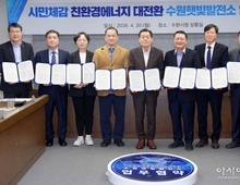 [아시아통신] 수원특례시가 수원햇빛발전소 활성화를 위한 협력체계를 구축하고, ‘시민체감 친환경에너지 대전환’에 나선다. 수원시와 수원도시공사, 수원시민햇빛발전 사회적협동조합, 수원에너지 협동조합, 기후시민에너지협동조합, 수원상공회의소, 수원산업단지관리공단, 아이비케이(IBK) 기업은행 동수원지점은 20일 시청 상황실에서 업무협약을 체결하고, 수원햇빛발전소 건설·활성화를 위해 협력하기로 했다. 수원햇빛발전소 사업은 수원시의 공영주차장, 공공 유휴 부지를 활용해 시민·사회·단체·기업·공공기관이 공동으로 참여하는 태양광발전소를 조성·운영하고, 수익을 시민과 공유하는 ‘시민 체감형 재생에너지 사업’이다. 전국 최초로 ‘시민우선배당방식’을 도입해 태양광 발전에 따른 수익금을 시민 투자자에게 우선 배당한다. 올해 10월까지 수원햇빛발전㈜를 설립하고, 11월부터 내년 6월까지 수원햇빛발전소를 건설할 계획이다. 2027년 6월부터 2차 사업대상지를 발굴하고, 햇빛발전소를 확대한다. 공영주차장, 공공유휴부지 등 사업대상지를 발굴해 발전 용량 20MW 이상의 태양광발전소를 설치·운영할 계획이다. 협약식에는 이재준 수원특례시장과 이영인 수원도시공사 사장, 윤은상 수원시민햇빛발전