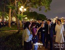 [아시아통신] 베트남을 국빈 방문한 이재명 대통령과 김혜경 여사는 23일(현지시간) 저녁 하노이 호안끼엠 호수 인근 구시가지를 깜짝 방문해 베트남 국민들과 소통하며 저녁 시간을 함께했다고 안귀령 부대변인이 서면 브리핑했다. 호안끼엠 호수는 하노이 중심부에 위치한 대표적인 명소로, 베트남 국민들의 휴식과 여가가 이뤄지는 공간이다. 이번 일정은 베트남 국민들의 일상적인 생활공간 속으로 자연스럽게 스며들어 보다 깊이 있는 교감과 이해를 나누기 위한 취지로 마련됐다고 안 부대변인이 설명했다. 베트남 국민들은 한국어로 "안녕하세요", "반갑습니다", 영어로 "웰컴 투 베트남" 등을 외치며 이재명 대통령 부부를 반갑게 맞이했다. 이에 이 대통령 부부는 베트남어로 '안녕하세요'인 "신짜오"로 화답하며, 베트남 국민들과 악수를 나누고 하이파이브를 하는 등 친근한 교감을 이어갔다. 특히 인근 건물 3층에 위치한 카페에서 손을 흔들며 환영의 뜻을 전하는 베트남 국민들에게도 일일이 손을 흔들어 인사를 건네며 현장의 분위기를 더욱 따뜻하게 만들었다. 이 대통령은 현지에서 초등학교에 다니고 있다는