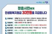 [아시아통신] 정읍시가 고물가와 경기 침체로 신음하는 시민들의 가계 부담을 덜어주기 위해 오는 19일부터 모든 시민에게 1인당 30만원의 민생회복지원금을 지급한다. 이번 지원금 지급은 2024년 말에 이어 두 번째로 시행되는 조치로, 시는 지난해에도 강도 높은 재정 혁신과 예산 절감 노력을 기울여 재원을 확보했다. 이를 시민들에게 환원해 지역 내 소비를 촉진하고 민생 경제에 활력을 불어넣겠다는 계획이다. 지급 대상은 2025년 12월 15일 이전부터 신청일 현재까지 정읍시에 주민등록을 두고 거주 중인 모든 시민이다. 여기에는 결혼이민자와 영주권자도 포함된다. 다만, 기준일 이후 사망했거나 타 지역으로 전출한 자, 주민등록이 말소된 경우에는 지급 대상에서 제외된다. 신청 기간은 오는 19일부터 2월 13일까지 4주간 진행된다. 지원금을 받으려는 시민은 2025년 12월 15일 기준 주소지 관할 읍·면·동 행정복지센터를 방문해 신청하면 된다. 본인 신청 시 신분증과 신청서를 지참해야 하며, 대리인이 방문할 경우 위임 동의서와 위임자 및 대리인의 신분증을