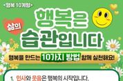 [아시아통신] 2005년 영국 소도시 슬라우시는 주민을 대상으로 ‘행복은 정말 바꿀 수 없는 걸까?’라는 질문에서 출발한 사회 실험을 약 12주간 진행했다. 주민들은 감사하기, 웃기, 운동하기, 친절 베풀기 등 의식적인 행동을 실천했고, 그 결과 참여자의 행복도가 약 30% 이상 증가했다. 기후에너지환경부도 이와 유사한 사회 실험을 조직 내에서 구현하고자 한다. 3월 6일부터 조직 내 협업과 배려 문화를 확산한 직원을 매주 ‘행복전도사’로 선정하는 ‘행복한판’ 프로그램을 시행한다. 선정된 직원에게는 소정의 상품이 수여되며, 해당 부서에는 소규모 간식이 제공된다. ‘행복한판’은 협업, 배려, 감사, 웃음 등을 통해 행복을 확산한 직원을 동료 추천으로 선정하고 포상하는 제도다. 기후에너지환경부는 2월 9일부터 ‘행복은 삶의 습관입니다’를 주제로 한 행복 10계명 실천 운동도 진행 중이다. 행복 10계명은 인사와 웃음, 감사 표현, 칭찬, 운동, 봉사활동, 독서 및 문화예술 활동, 마을공동체 만들기, 기후위기 대응, 물질욕구 절제, 자기 삶 충실 등으로 구성됐다. 한편, 기후에너지환경부는 제1호 행복전도사로 기후에너지재정과 이창환 사무관을 선정했다. 이 사무관은