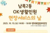 [아시아통신] 울산 동구는 오는 10월 15일 오후 2시부터 4시까지 명덕복합문화광장에서 ‘남목2동 OK생활민원 현장서비스의 날’ 행사를 개최한다. 이번 행사는 올해 여섯 번째로 열리는 OK생활민원 현장서비스의 날 행사로 주민들의 일상생활 속 불편 해소와 삶의 질 향상을 위한 다양한 분야로 구성했으며, 이번 행사 운영을 위해 자원 봉사자, 민간 기술자, 관계 공무원 등 100여 명이 참여한다. 서비스 분야는 총 9개로 주민 편익(칼갈이, 분갈이, 자전거 수리, 안경 및 귀금속 세척), 건강관리(심혈관질환, 비만예방, 치매예방), 구정 홍보(동구 SNS 홍보, 탄소중립 생활실천 홍보, 재활용 분리배출 홍보), 생활안전(심폐소생술 체험, 소화기 사용 체험), 생활경제(사회적경제 기업 제품 홍보), 생활상담(구민고충상담), 동 특화사업(가을향기 담은 캘리그라피), 재능기부(타로 심리 상담) 등이 있다. 유료 체험 부스로는 반려식물 키우기 체험이 마련되는데, 1인당 1개만 가능하며 빈 화분을 지참해야 한다. 2025년 OK생활민원 현장서비스의 날 전체 일정 및 남목2동 행사 정보는 울산 동구청 홈페이지[알