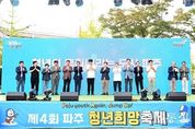 [아시아통신] 파주시는 지난 27일 금릉역 앞 중앙광장에서 열린 ‘제4회 파주 청년희망축제’가 시민들의 뜨거운 호응 속에 성공적으로 마무리됐다고 밝혔다. 올해 축제는 ‘파주청년, 다시 도약하다!(Paju Youth Again, Jump Up!)’을 주제로, 도약하는 청년세대의 열정과 활력을 시민과 함께 나누는 장으로 마련됐다. 이번 축제의 백미는 개막식과 함께 진행된 ‘파주 청년 비전선포식’이었다. 청년정책협의체 공동위원장은 무대에서 ‘청년이 뿌리내리는 도시, 파주’라는 비전을 선포하며, 청년과 지역사회가 함께 나아갈 미래의 방향을 제시했다. 특히 청년들이 직접 낭독한 선언문과 청년친화도시 지정을 위한 기념행사는 파주시의 확고한 의지를 대외적으로 알리는 계기가 됐다. 오후 2시부터 8시까지 진행된 이번 축제는 ▲사전공연 ▲청년 골든벨 ▲청년 가요제 ▲청년공간 특별강좌 ▲프리미엄 수제 맥주 시음 ▲청년창업가 플리마켓 ▲무료 체험공간 ▲대형 ‘파랑’ 포토존 등 다채로운 프로그램으로 꾸려졌다. 가요제 무대에서는 청년들의 끼와 열정이 빛났으며, 청년창업가 판매공간 및 수제 맥주 시음 공간은 청년 창업 아이