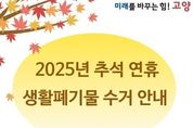 [아시아통신] 고양특례시는 다가오는 추석 연휴를 맞아 시민들이 쾌적하고 깨끗한 환경 속에서 명절을 보낼 수 있도록 ‘추석 연휴 생활쓰레기 관리대책’을 수립해 본격 추진한다. 시는 10월 3일부터 9일까지 연휴 기간 동안 상황반과 기동청소반을 운영해 각종 민원과 긴급 상황에 신속 대응하고, 생활쓰레기와 무단 방치쓰레기를 집중 수거할 예정이다. 아울러 연휴 기간 쓰레기 배출일 사전홍보와 쓰레기 상습 투기 우려지역에 대한 집중 단속도 병행한다. 특히, 10월 8일 대체공휴일에도 생활쓰레기 수거를 정상적으로 실시해 시민 불편을 최소화할 방침이다. 다만, 10월 5일, 6일(월·추석), 7일 3일간은 휴무로 인해 수거가 이뤄지지 않는다. 이에 따라 쓰레기 배출은 반드시 수거일 전날 일몰 이후에 해야한다. 시 관계자는 “쾌적하고 깨끗한 명절 분위기 조성을 위해 추석 연휴 기간 생활쓰레기 수거에 만전을 기하겠다”며 “각 가정에서도 음식물 쓰레기 줄이기, 재활용품 분리배출 등 생활쓰레기 감량에 적극 협조해 주시기를 바란다”고 전했다.