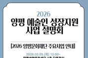 [아시아통신] 양평문화재단은 오는 3월 5일, 양평생활문화센터 1층 다목적실에서 지역 예술인의 지속 가능한 활동을 지원하기 위한 ‘2026 예술인 성장지원사업 설명회’를 개최한다고 밝혔다. 이번 사업은 지역 내 신진·청년 예술인을 중심으로 창작 역량에 비해 부족했던 성장 기회를 제공하고, 기존 지원사업을 일회성 지원으로 그치지 않고 지속적인 지원 체계를 구축하기 위해 마련됐다. 재단은 예술인 스스로 활동할 수 있는 환경을 만들고 지역 예술 생태계를 활성화하는 것을 목표로 하고 있다. 설명회는 크게 세 가지 내용으로 구성된다. 첫째, 2026년 진행 예정인 공모 지원사업 계획을 공유한다. 양평문화재단의 주요 사업인 ‘모든예술31’, ‘물맑은 어울림 음악회’, ‘생활문화지원사업’은 물론 외부 기관의 공모사업 정보도 함께 제공될 예정이다. 둘째, 예술인을 위한 행정 실무 교육이 진행된다. 공모사업의 구조와 신청 절차, 사업계획서 작성 방법, 정산 시 유의사항 등 현장에서 필요한 실무 중심 교육을 통해 예술인의 행정 부담을 완화할 것으로 기대된다. 셋째, 향후 예술인 지원 확대를 위한 수요 조