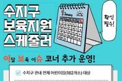 [아시아통신] 용인특례시 수지구는 보육 정책 등을 알기 쉽게 정리한 ‘보육지원 스케줄러’에 이달 보육 이슈 항목을 신설했다고 15일 밝혔다. 구는 사업별 신청·정산 시기가 달라 신청 오류, 누락 등의 민원이 빈번함에 따라, 이를 해결하기 위해 2025년부터 보육지원 스케줄러를 운영하고 있다. 보육지원 스케줄러는 어린이집과 보육 교사 등을 대상으로 각종 지원 사업의 일정 등을 사전에 공유해 대상자들이 빠짐없이 신청할 수 있도록 돕고자 마련됐다. 구는 매달 신청·정산 지원사업, 제출일, 제출 방법, 주요 변경사항 등을 표로 만들어 보육인 오픈 채팅방과 보육통합정보시스템에 선보이고 있다. 여기에 이달 보육 이슈 항목을 추가해 지역 내 어린이집 182곳을 대상으로 매월 각종 지원사업을 사전에 알리고 변경되는 정책과 최근 이슈, 주요 정보 등을 상세히 제공하기로 했다. 구 관계자는 “보육 교사들의 업무 부담을 덜고, 효율적인 보육 현장을 지원하기 위해 이달 보육 이슈 코너를 마련했으니 유용하게 이용해 주시기를 바란다”고 했다.