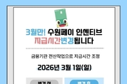 [아시아통신] 수원특례시(시장 이재준)가 3월 수원페이 인센티브를 1일 오후 3시부터 지급한다. 수원페이 인센티브 지급 시작 시각은 매달 1일 오전 9시였지만, 3월 1일 금융기관 전산 작업으로 인해 오후 3시로 늦춰진다. 4월부터는 다시 1일 오전 9시부터 지급한다. 인센티브는 3월 1일 오후 3시부터 예산이 소진될 때까지 지급한다. 1인당 충전 한도는 50만 원이고, 인센티브는 10%다. 50만 원을 충전하면 인센티브 5만 원을 받을 수 있다. 1인당 수원페이 보유 한도는 100만 원이다. 잔액을 소비해야 여유분만큼 충전할 수 있다. 수원페이는 경기지역화폐 앱이나 오프라인 충전소에서 충전할 수 있다. 오프라인 충전소는 공휴일에는 운영하지 않으므로 유의해야 한다. 오프라인 충전소 목록은 수원시 홈페이지(www.suwon.go.kr)에서 ‘수원시 지역화폐’를 검색해 공지사항 게시판에서 확인할 수 있다.